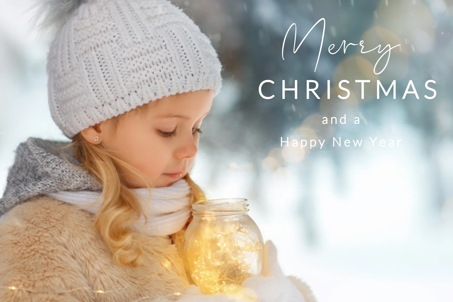 Sfeervolle foto kerstkaart met luxe folie bedrukking. Op de foto staat een kind, een meisje, die lichtjes vast houdt. Wil je een kerstkaart maken met daarop je eigen kinderen en of huisdier dan is dit een uitstekende basis. De foto kun je namelijk gemakkelijk vervangen door een eigen foto.