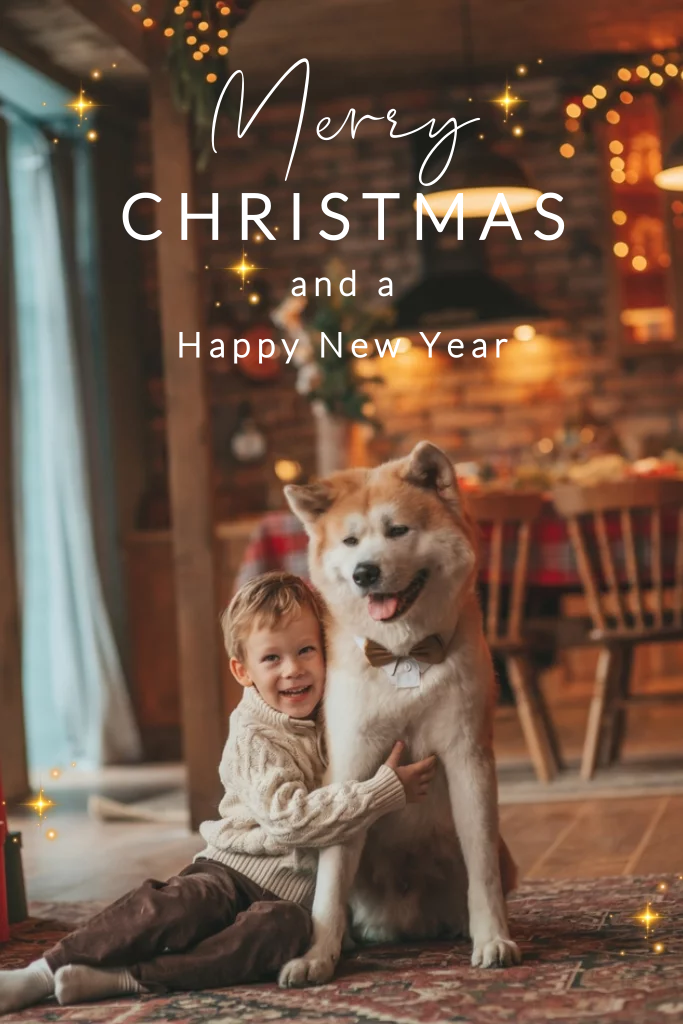 Kerstkaart met grote foto van hond en jongen