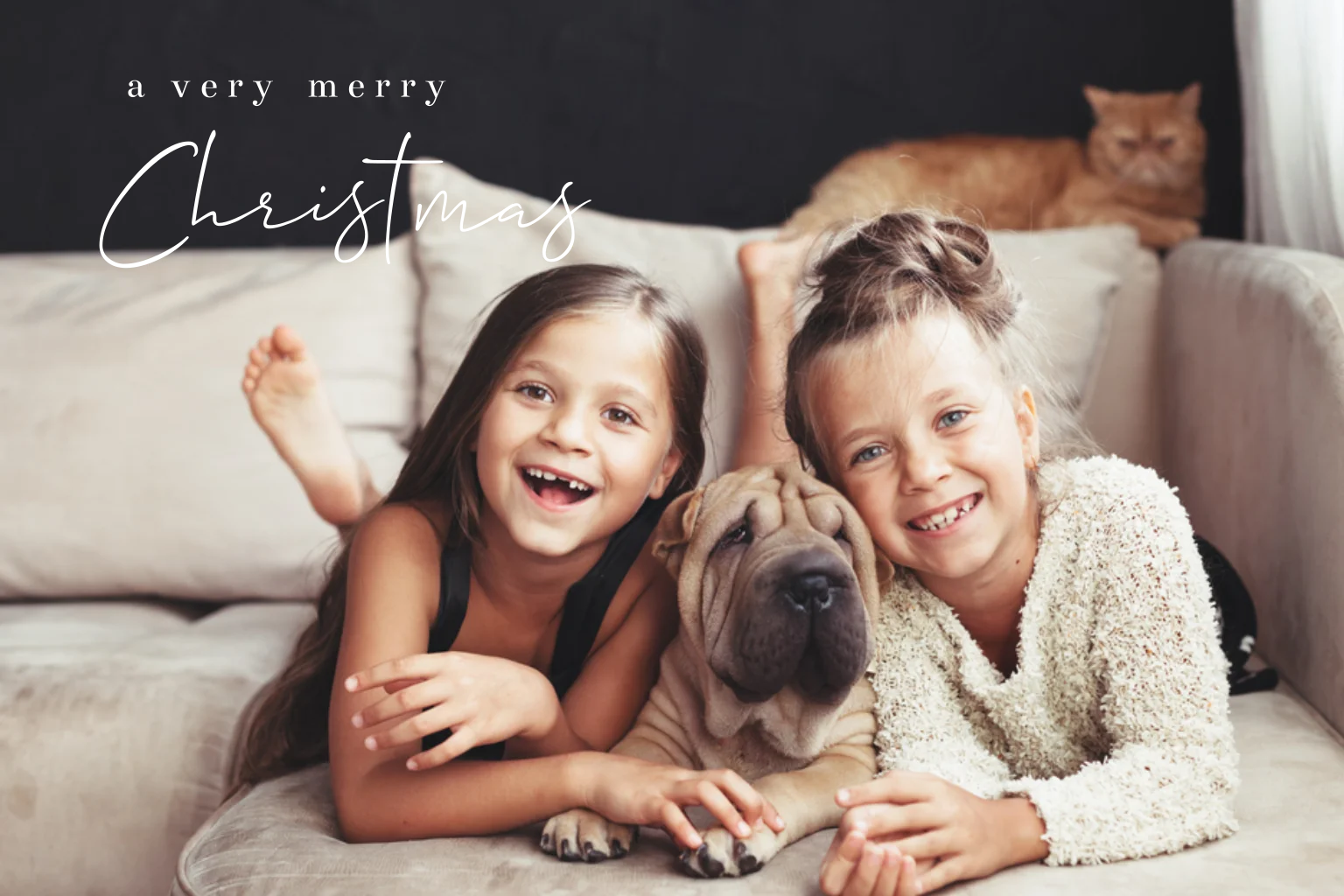 Mooie foto kerstkaart met luxe folie bedrukking. Op de foto staat twee kinderen, twee meisjes, een poes en een hond. Wil je een kerstkaart maken met daarop je eigen kind en of huisdier dan is dit een uitstekende basis. De foto kun je namelijk gemakkelijk vervangen door een eigen foto.