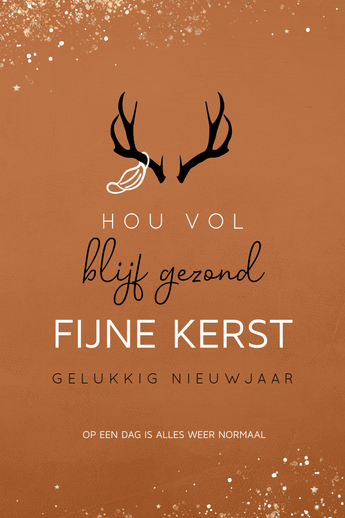 Corona kerstkaart met de tekst "Hou vol, blijf gezond." Boven de tekst een herten gewei en een mondkapje. Samen met de trendy roestbruine achtergrond en goudkleurige accenten een hippe kaart! Voeg een eigen kerstgroet toe op de achterzijde. Pas de teksten naar wens aan in de editor.