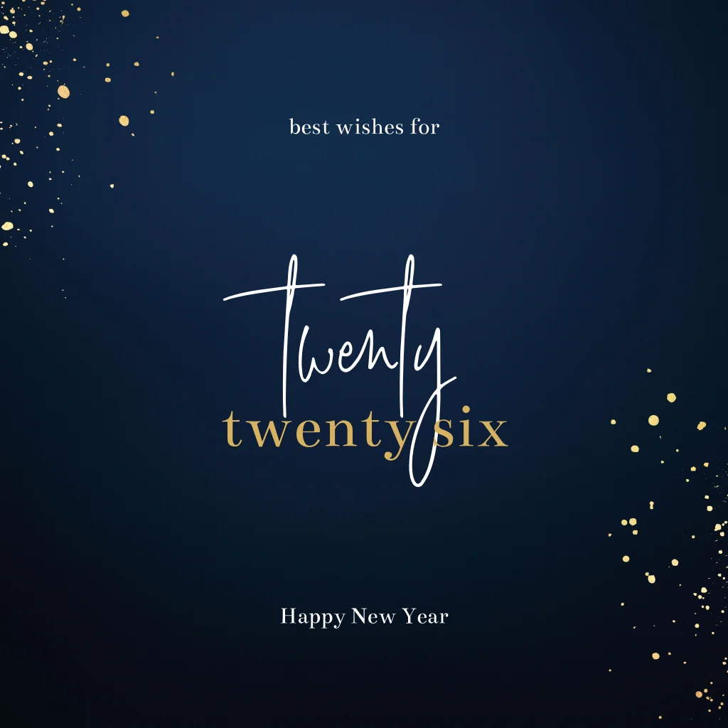 Laat familie en vrienden weten dat je aan ze denkt. De tekst op deze kaart: "Best wishes for twenty twenty six" Deze kerstkaart heeft een donkerblauwe achtergrond met tekst in wit en goudkleur, een chique combinatie. De goudkleurige spetters maken het kaartje compleet. Teksten, kleuren en lettertypes zijn naar eigen wens aan te passen.
