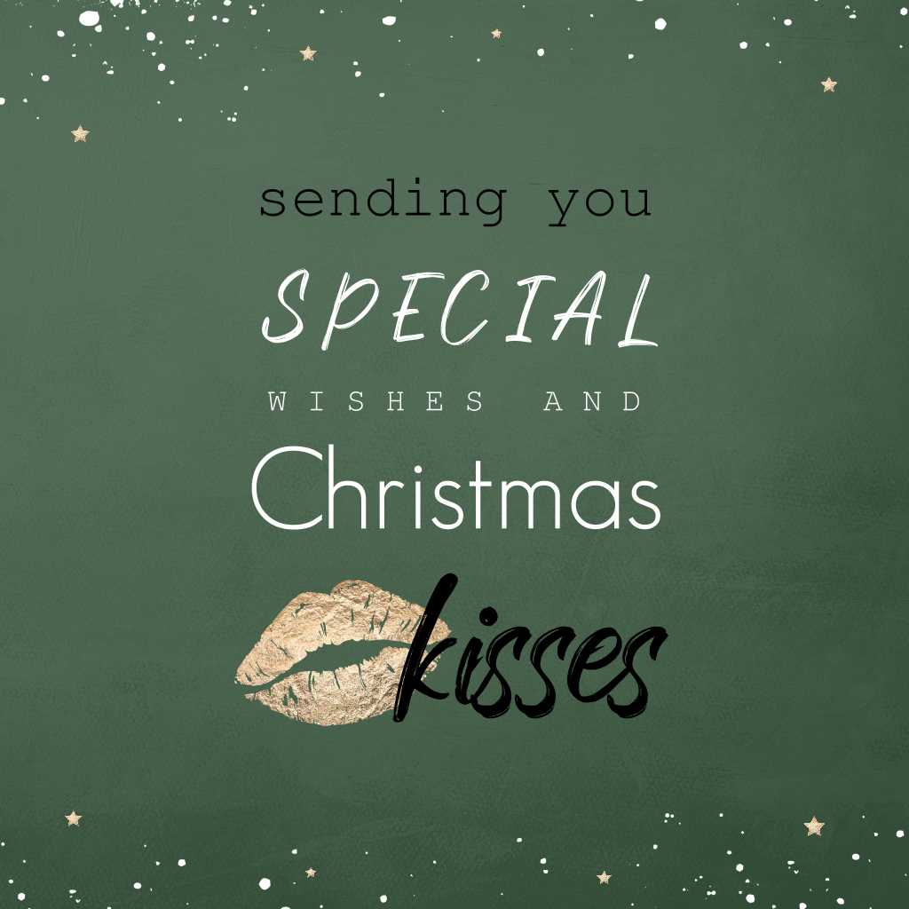 Hippe kerstkaart met de tekst: Sending you special wishes and Christmas kisses. Deze kaart heeft een mooie warme groene achtergrond en een illustratie van een kus in goudkleur. Bij de tekst is gebruik gemaakt van verschillende lettertypes. Deze kaart kun je zelf bewerken in de editor en naar je eigen smaak aanpassen.