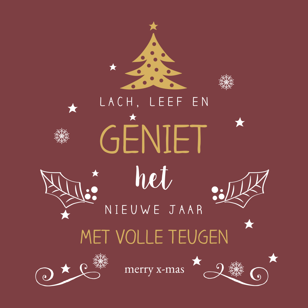 Kerstkaart met de tekst "Lach, leef en geniet, het nieuwe jaar met volle teugen" en leuke illustraties van een kerstboom, kerststerretjes en hulst. Deze kaart heeft een warme trendy achtergrondkleur met tekst en illustraties in wit en goud. Maak van deze kaart je eigen persoonlijke kerstkaart. Pas de teksten en kleuren naar je eigen smaak aan in de editor.
