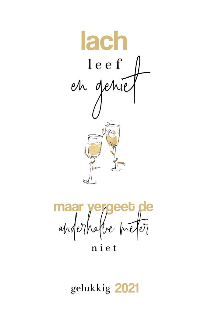 Lach, leef en geniet, maar vergeet de anderhalve meter niet. Dat is de boodschap op deze hippe corona kerstkaart. De kaart is overwegend wit en clean en er is gebruik gemaakt van verschillende lettertypes in zwart en goudkleur. De 2 proostende glazen maken de kaart extra feestelijk.