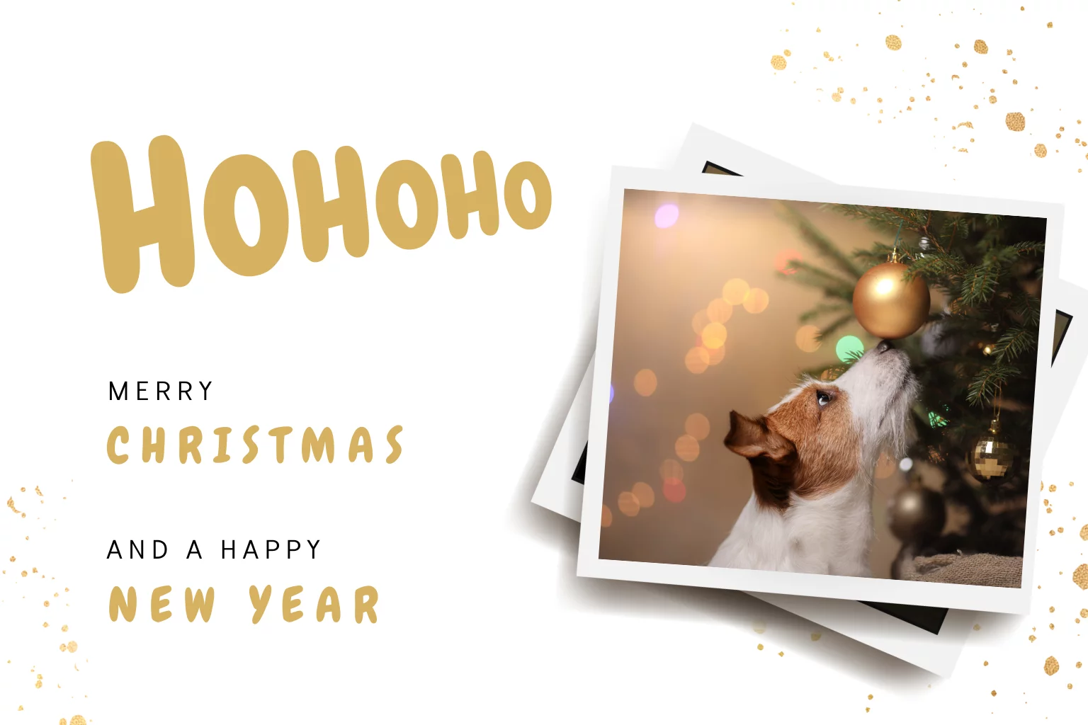 Ho Ho Ho kerstkaart in wit met goudkleur. Deze kaart is clean en rustig met foto en enkele spetters. Voeg een leuke foto toe van jezelf of je huisdier en maak van deze kaart je eigen persoonlijke kerstkaart.