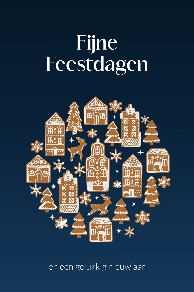 Een prachtige oerhollandse kerstkaart met illustraties van grachtenpandjes in peperkoek stijl. Op deze kaart zie je daarnaast allerlei, bomen, ijskristallen en hertjes vormgegeven als koekjes. Deze kerstkaart bevat goudfolie en dit zorgt voor een extra luxe uitstraling. De ronde hoeken geven een speels effect aan deze kaart. Pas deze kerstkaart naar eigen smaak aan in onze online editor en tover een lach op het gezicht van de ontvangers.