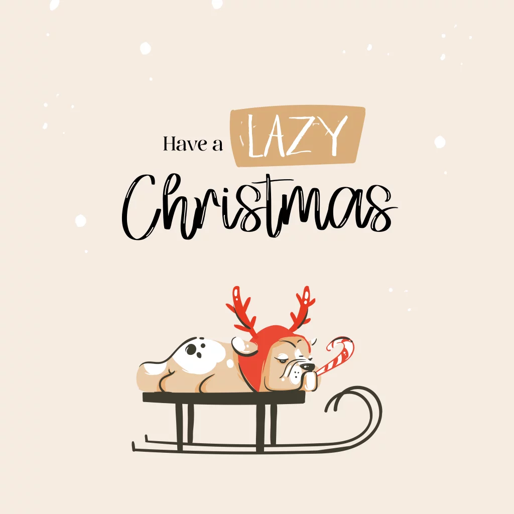 Stuur vrienden en familie deze vrolijke en unieke wenskaart met een persoonlijke boodschap. Op deze kerstkaart een lazy hond liggend op een slee met op de achtergrond sneeuw. De toepasselijke tekst 'Have a Lazy Christmas' past er helemaal bij. Deze honden kerstkaart zeker geschikt voor hondenliefhebbers.