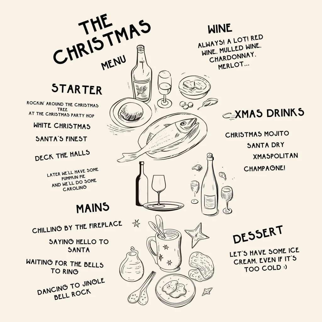Typografische kerstkaart met kerstmenu en leuke illustraties