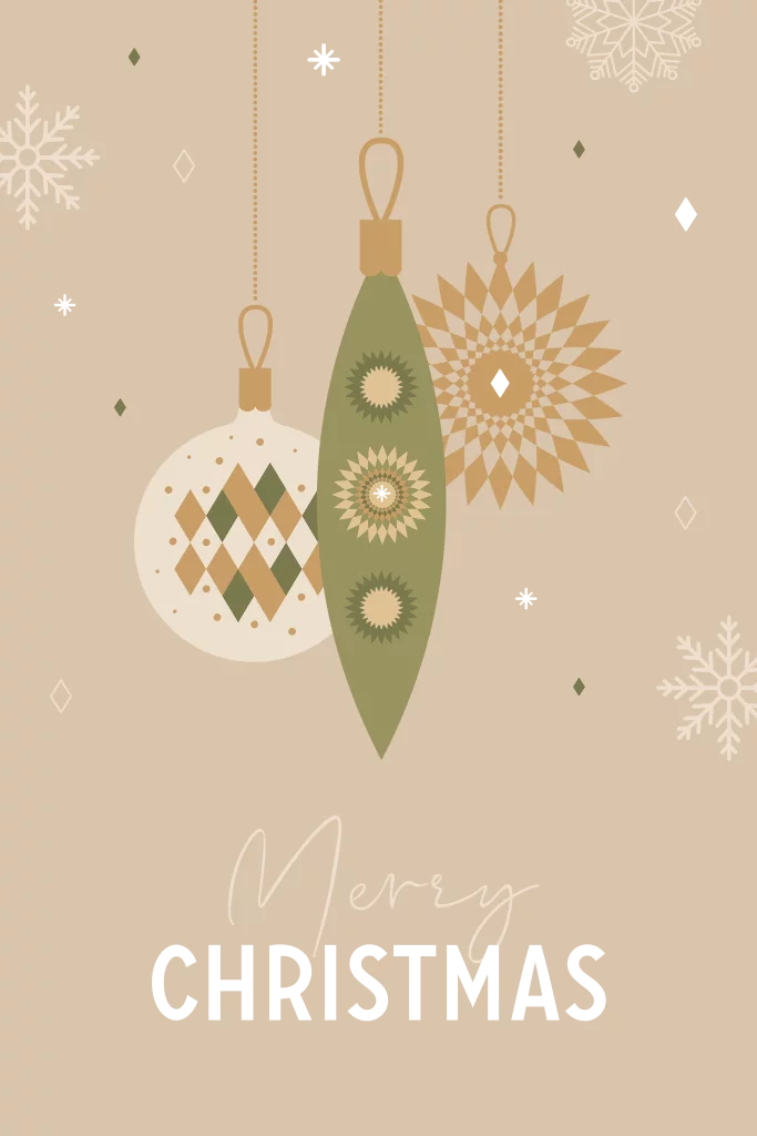 Stijlvolle kerstkaart met kerstballen, ijskristallen en goudfolie met ronde hoeken