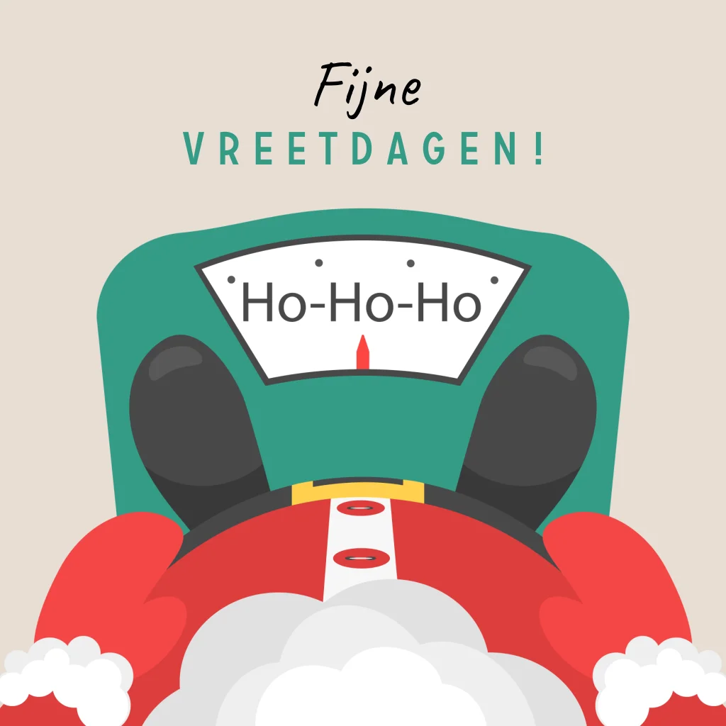 Grappige kerstkaart met een kerstman die op de weegschaal staat. Op de weegschaal staat Ho-Ho-Ho. Wie wens jij fijne vreetdagen? Pas de kaart naar je eigen wensen aan in de editor.