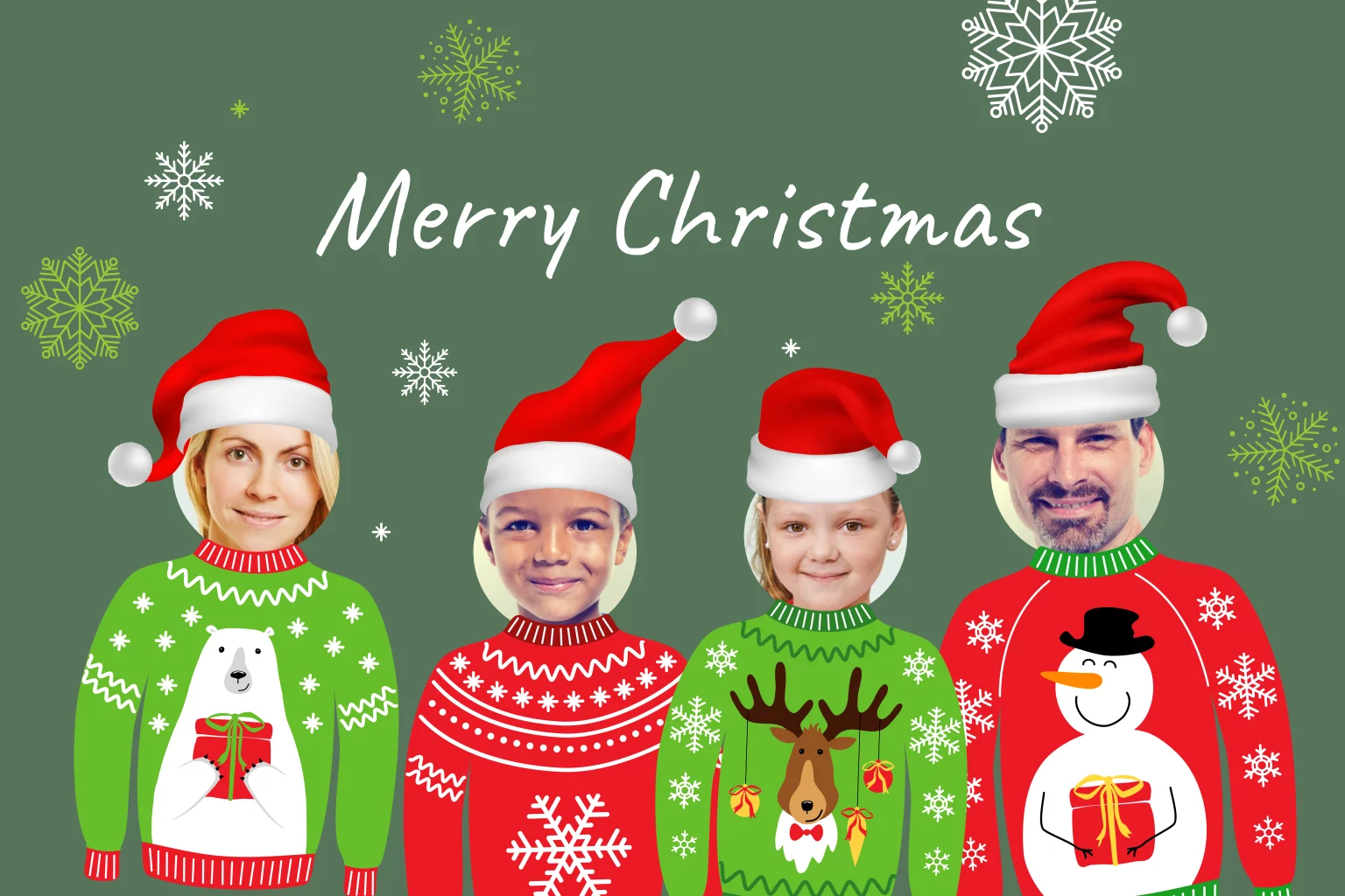 Grappige kerstkaart met sneeuw en kersttruien. Zet in de ronde kaders je eigen foto's, zo lijkt het net of jullie een kerstrui en kerstmuts op hebben. Pas de kaart in de editor aan. Hulp nodig? Wij helpen je graag!