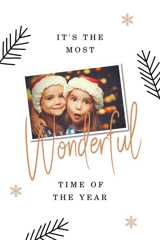 Hippe kerstkaart in zwart wit met koperkleur. Plaats je eigen persoonlijke foto. Deze kaart is gedecoreerd met takjes en sneeuw sterretjes. Teksten, kleuren en lettertypes kun je aanpassen in de editor.