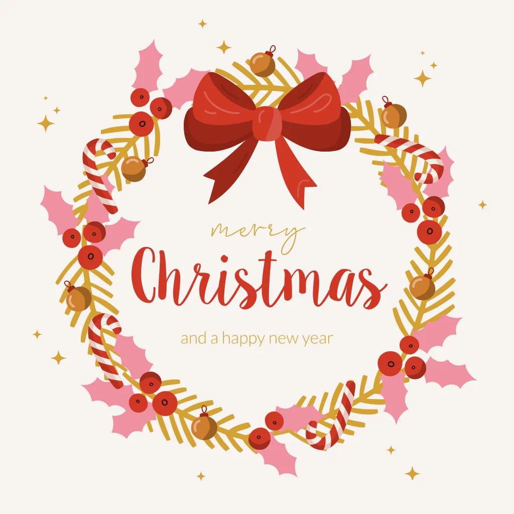 Een prachtige kerstkaart met een kerstkrans. Deze kerstkrans bestaat uit geïllustreerde hulst bladeren, zuurstokken, kerstballen en een strikje. De perfecte kerstkaart om een feestelijke kerstgroet te versturen. Maak deze kerstkaart helemaal af met de bijpassende oudroze envelop met gouden inlay. Merry Christmas!