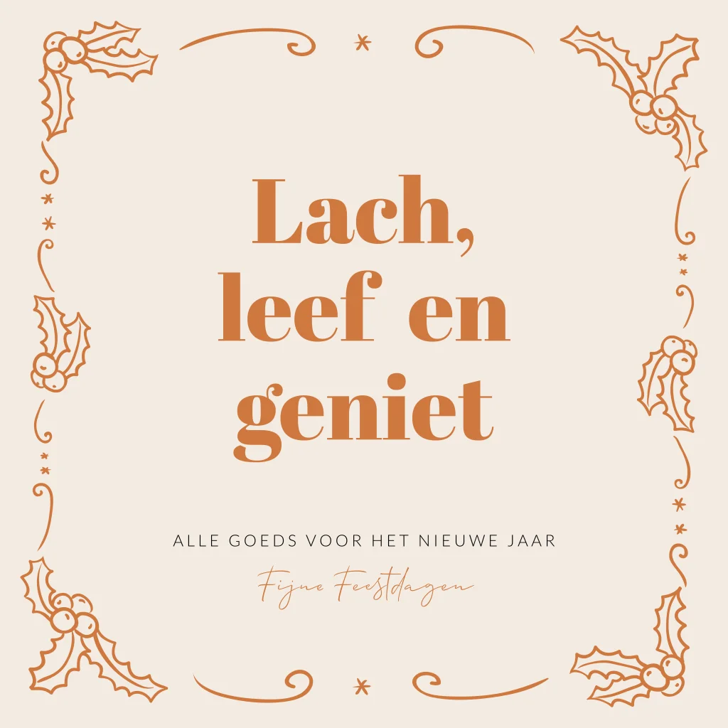 Kerstkaart met de tekst "Lach, leef en geniet, met leuke illustraties van een kleine kerstboom, kerststerretjes en hulst. Een hippe kerstkaart om familie en vrienden een gelukkig nieuwjaar te wensen. Maak van deze kaart je eigen persoonlijke kerstkaart. Pas de teksten en kleuren naar je eigen smaak aan in de editor.