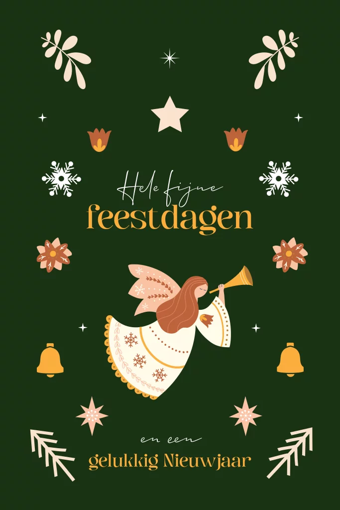 Een kerstkaart met een engel! Om de engel heen zie je allerlei kleine kerst illustraties. Pas deze kerstkaart naar eigen wens aan in onze online editor en maak de kerstkaart helemaal af met een donkergroene envelop. Hele fijne feestdagen en een gelukkig Nieuwjaar!