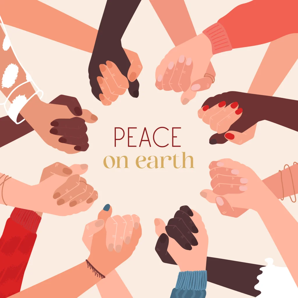 Kerstkaart met een illustratie van een groep mensen met verschillende etniciteiten die elkaars handen vasthouden. Op de kaart staat de tekst 'Peace on earth'. Geef met deze kerstkaart aan dat je vrede belangrijk vindt.