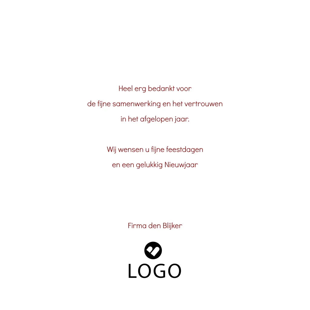 Deze kerstkaart is ook zeker geschikt als zakelijke kerstkaart. Zet op de binnenzijde je eigen bedrijfslogo. De afbeelding van het logo dient als voorbeeld en wordt niet gedrukt. Deze kun je verwijderen of plaats hier je eigen logo overheen.