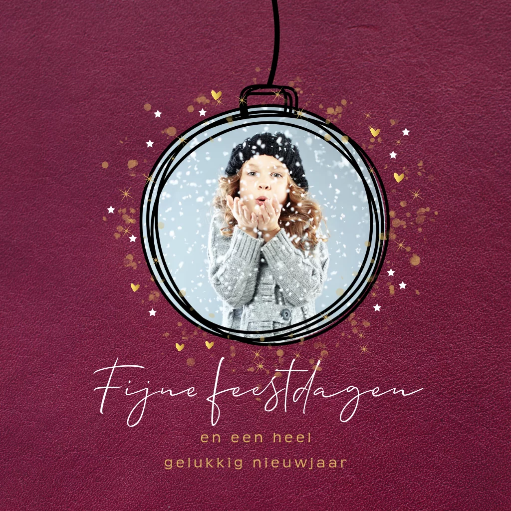 Een hippe kerstkaart met afgeronde hoeken en de tekst "Fijne feestdagen en een heel gelukkig nieuwjaar". Op deze kaart staan goudkleurige hartjes en witte sterretjes op een lederlook achtergrond. In de kerstbal voeg je heel makkelijk jullie eigen foto toe. De afgeronde hoeken maken de kaart luxer.