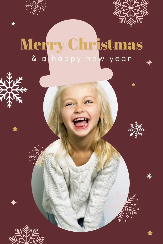 Hippe kerstkaart met ijskristallen en sneeuwpop. Zet in de sneeuwpop een eigen foto. Dit geeft een grappig effect aan deze trendy kerstkaart. Pas de teksten, kleuren en lettertypes naar je eigen smaak aan in de editor.