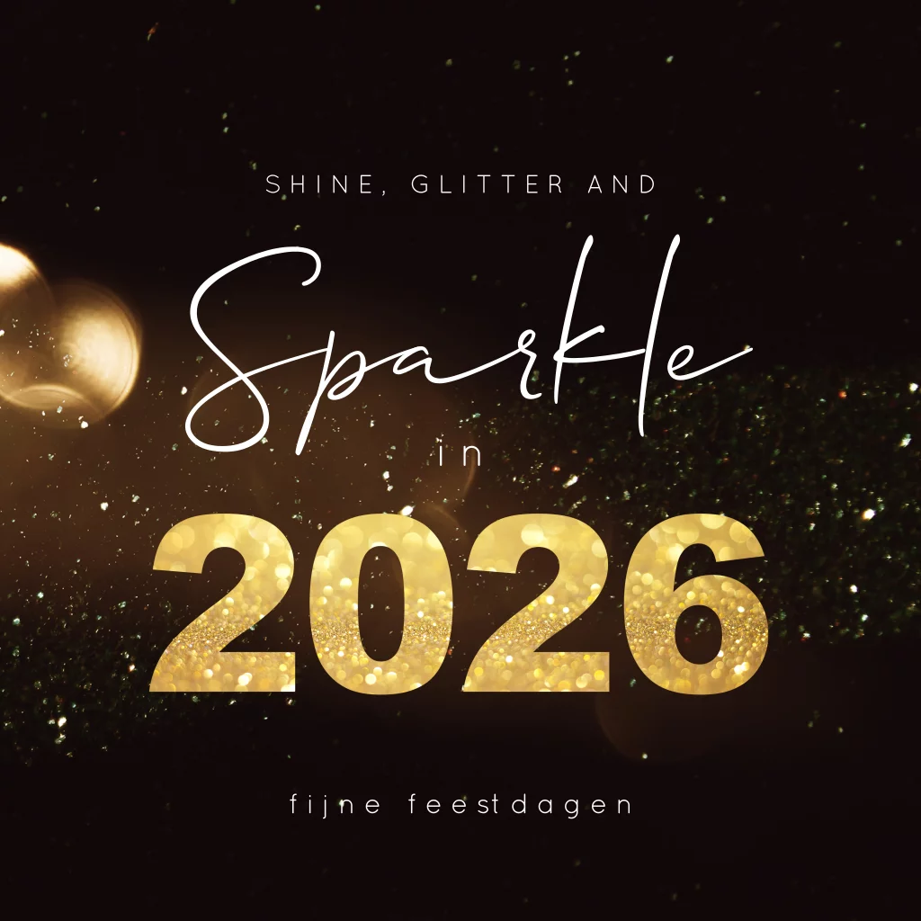 Sparkle in 2026! Een hippe kerstkaart met de tekst " shine, glitter and sparkle in 2026". De donkere achtergrond met de gouden glinsteringen geven een feestelijk effect aan deze kaart. Teksten en kleuren zijn eenvoudig aan te passen in onze editor.