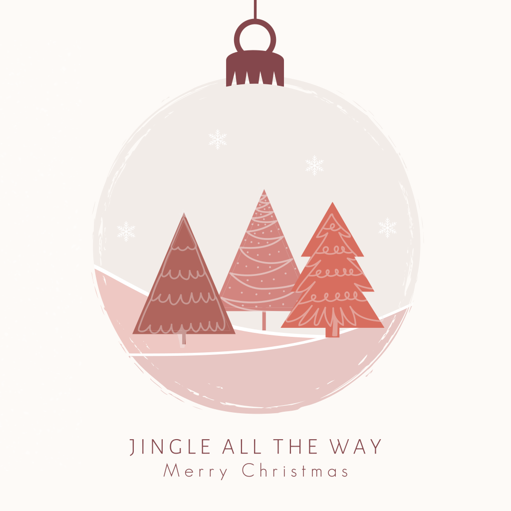 Jingle all the way! Hippe kerstkaart met kerstbal en kerstbomen in trendy kleuren. Teksten en kleuren zijn makkelijk aan te passen in onze editor.