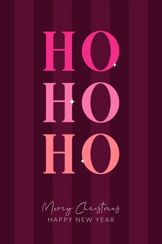 Een typografische kerstkaart met opvallende kleuren! Op deze kerstkaart staat de tekst ´Ho, ho, ho, Merry Christmas, Happy new year'. Deze kerstkaart heeft een gestreepte achtergrond en typografische letters. Pas deze kaart naar eigen wens aan en stuur je warme kerstgroet.