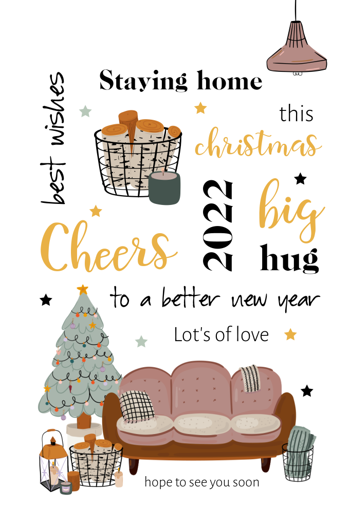Typografische kerstkaart met vrolijke illustraties van een kerstboom, bankstel, hanglamp en een mand met open haard hout. Een huiselijk sfeertje, want thuis kerst vieren is wat we doen dit jaar i.v.m. de corona pandemie. Stuur een lieve kerstgroet naar familie en vrienden om te laten weten dat je aan ze denkt. Op deze kaart is gebruik gemaakt van verschillende lettertypes. De teksten zijn gemakkelijk aan te passen.