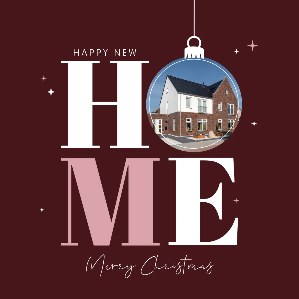 Kerstkaart met verhuisbericht Happy New Home met foto van je huis