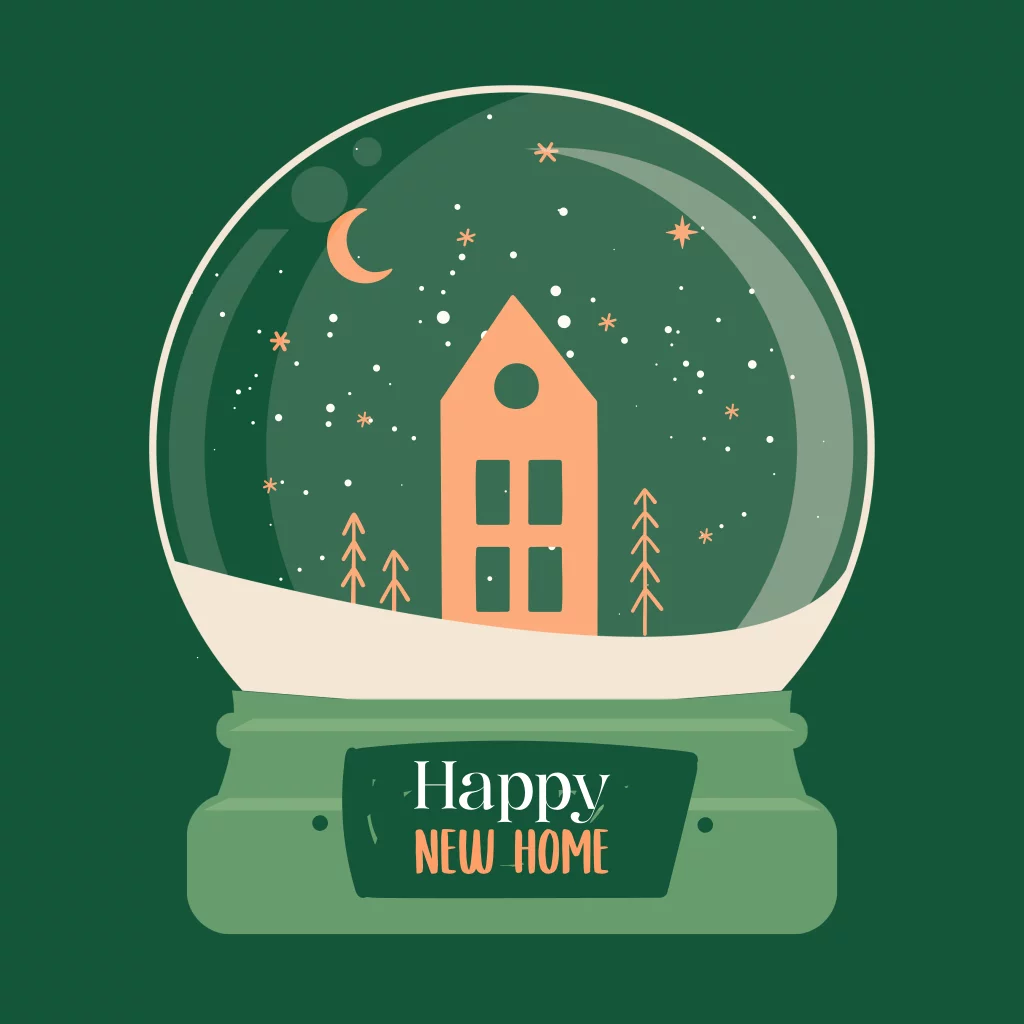 Happy New Home sneeuwbol kerst verhuiskaart met huisje en sneeuw