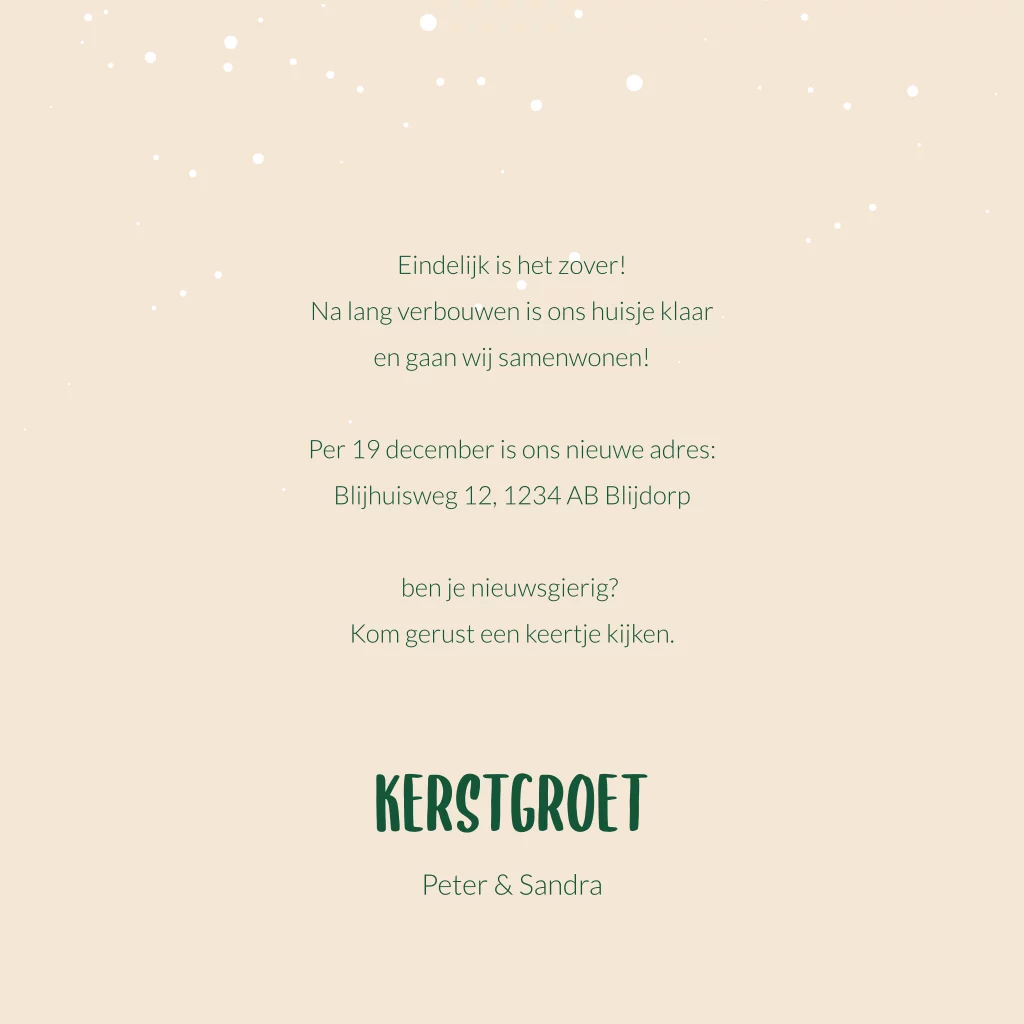 Een leuke verhuiskaart en kerstkaart in één. Wens met deze kerstkaart je familie en vrienden fijne feestdagen en geef gelijk jullie nieuwe adres door. Je ziet op deze kerstkaart een sneeuwbol met daarin een huisje met kerstbomen en sneeuw. Op de sneeuwbol staat de tekst 'Happy New Home'.