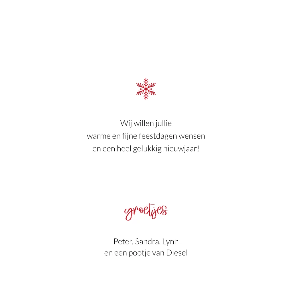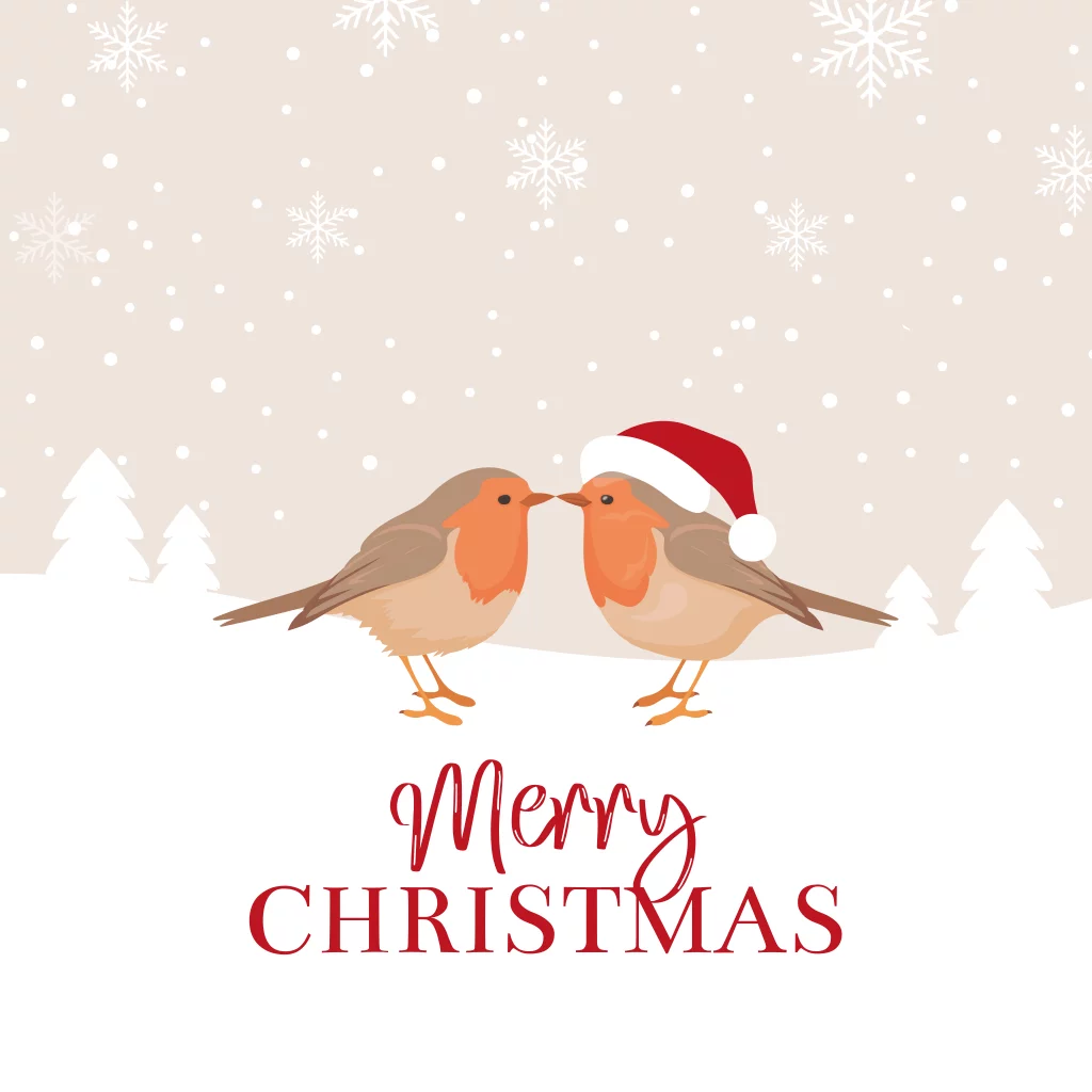Stuur vrienden en familie deze winterse kerstkaart met kerstbomen, sneeuw en twee lieve roodborstjes met kerstmuts op.