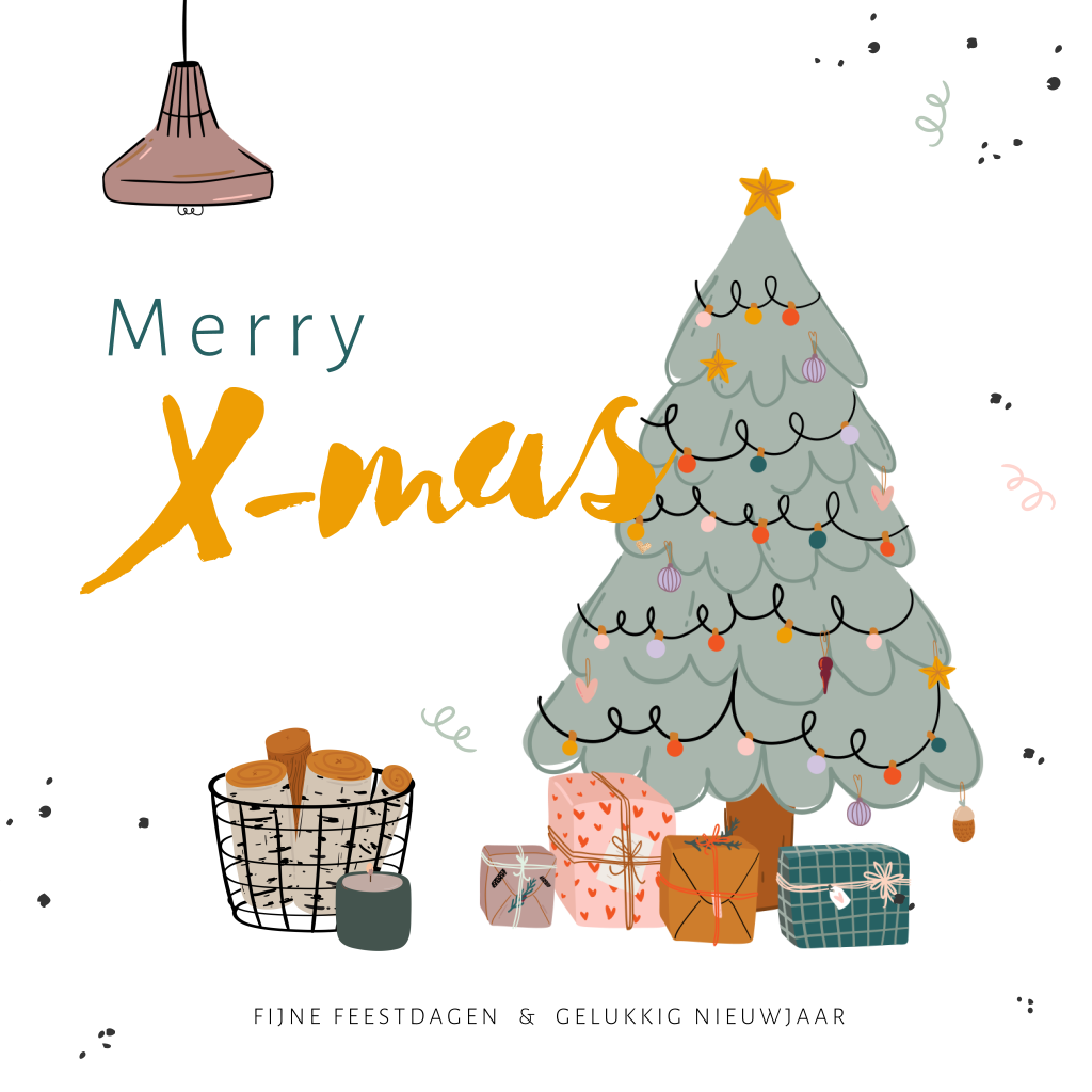 Op deze kaart staan illustraties van een kerstboom waaronder cadeautjes liggen, een lamp en open haard hout. Deze kaart is te bewerken in de editor en naar je eigen smaak aan te passen.