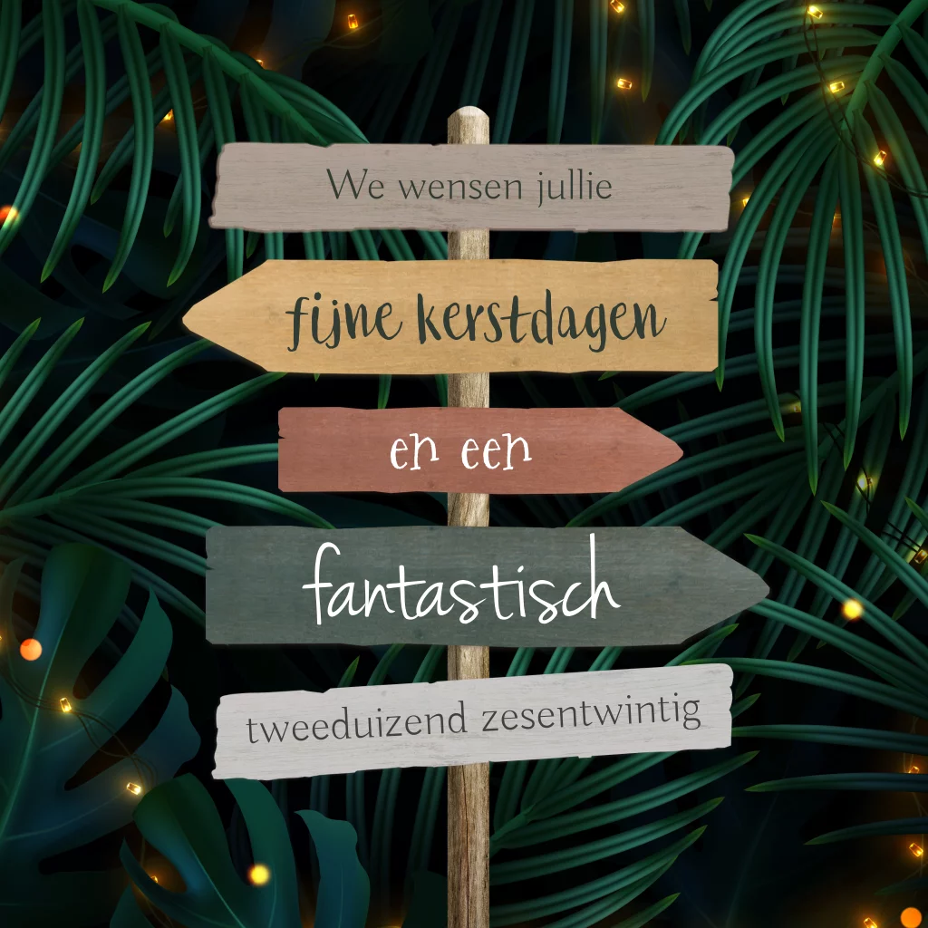 Kerstkaart met tekst op wegwijzers. Op deze kaart staan houten bordjes met tekst welke gemakkelijk is aan te passen. Op de achtergrond groene takken met sfeervolle lichtjes.