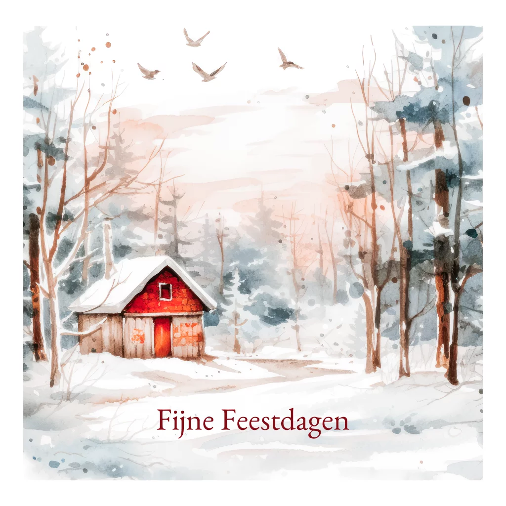 Kerstkaart met een nostalgisch winterlandschap. Op deze kaart zie je een knus huisje in de sneeuw met daaromheen besneeuwde bomen. Op de achtergrond een prachtige lucht met vliegende vogels. De illustratie is in een kader geplaatst met de tekst 'Fijne feestdagen'. Verstuur deze nostalgische kaart met een inspirerende kerstgroet.