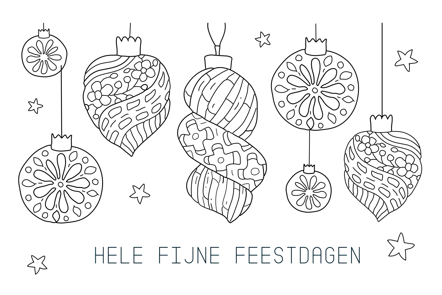 Kerstkaart zelf inkleuren met kerstballen en sterren