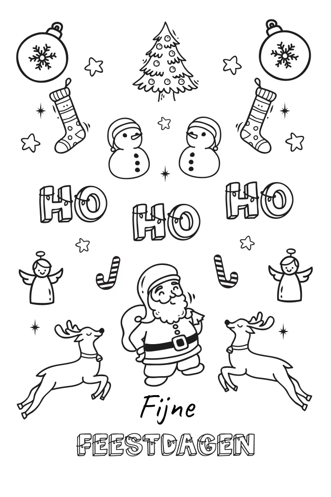 Op zoek naar een unieke kerstkaart om zelf in te kleuren? Ontdek dan deze prachtige kleurplaat met vrolijke tekeningentjes. Deze originele kerstkaart bevat een vrolijke kerstman, schattige rendiertjes, kerstballen, sneeuwpoppen, zuurstokken, kerstsokken en engeltjes. Laat je creativiteit de vrije loop en tover een lach op het gezicht van de ontvanger.