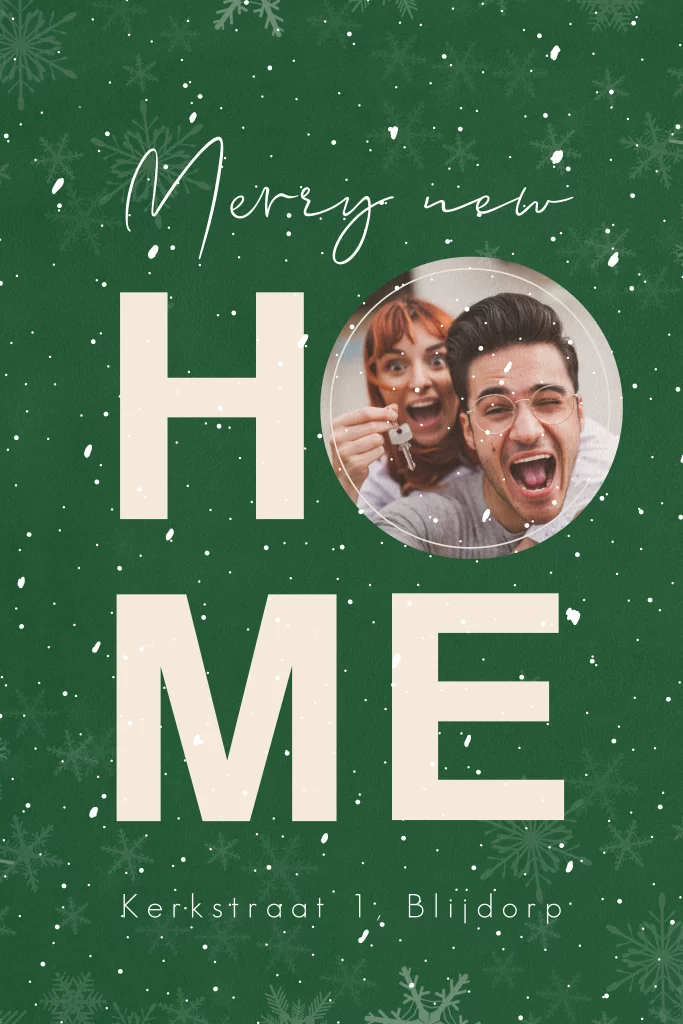 Gaan jullie verhuizen of samenwonen rond de feestdagen? Verstuur jullie nieuwe adres naar familie en vrienden met deze verhuis kerstkaart. Op deze kaart staat de toepasselijke tekst Merry New Home. Zet in de kerstbal een mooie foto van jullie huis of jezelf. Voeg je persoonlijke tekst toe op de achterzijde.