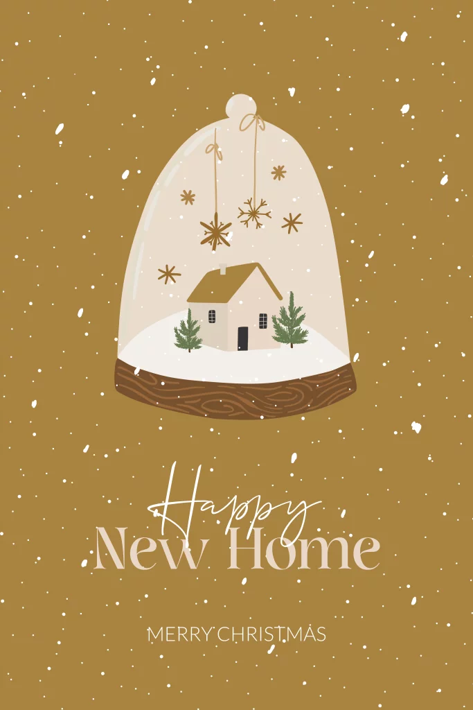 Ben je net verhuisd of ga je binnenkort verhuizen? Verstuur dan deze leuke verhuiskaart naar je familie en vrienden en wens ze gelijk fijne feestdagen. Op de kaart staat de toepasselijke tekst 'Happy New Home'. Deze kerst verhuiskaart heeft een mooi design met een illustratie van een sneeuwbol met huisje, sneeuw en kerststerren. Voeg je persoonlijke tekst toe op de achterzijde.