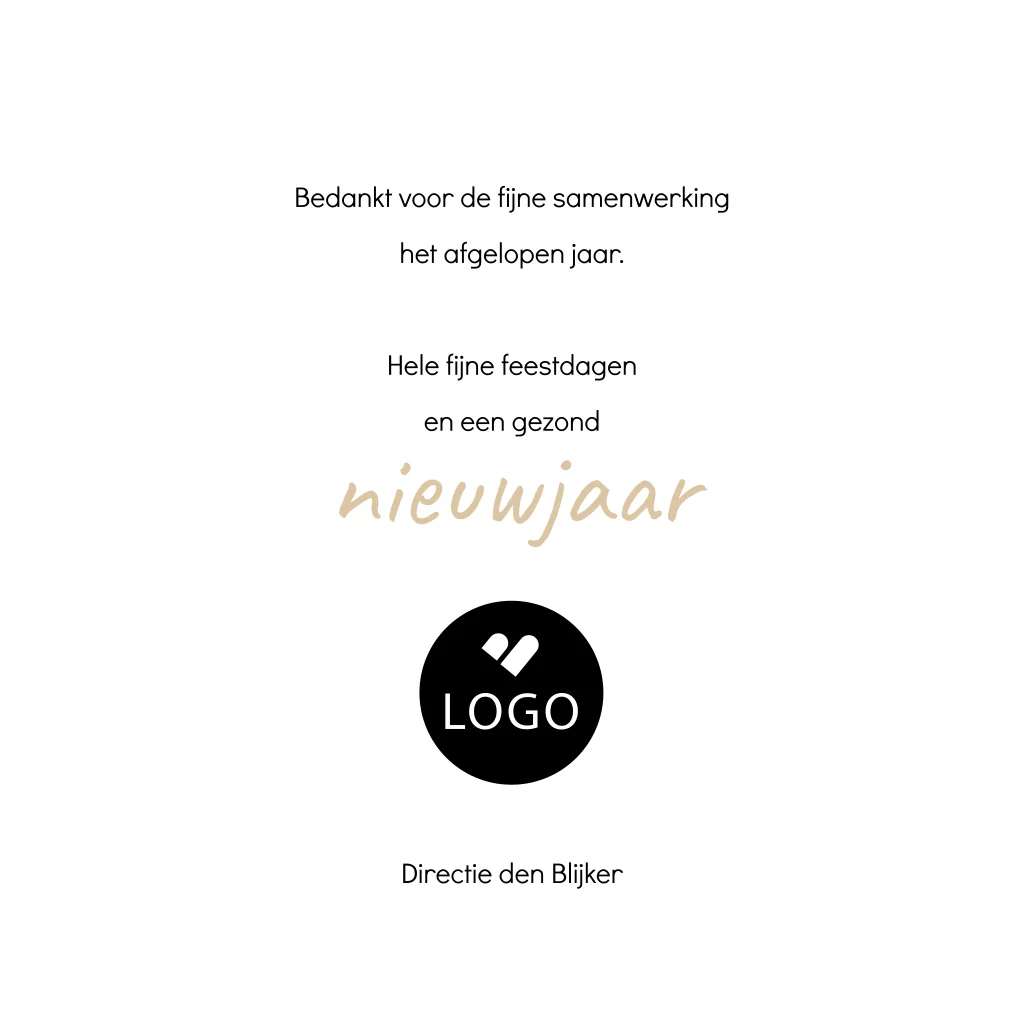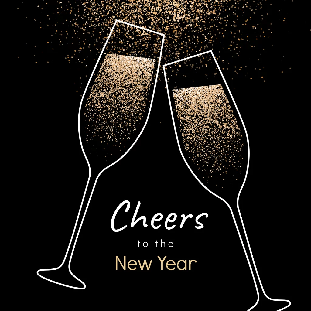 Zakelijke kerstkaart met een mooie zwarte achtergrondkleur. Hierdoor komt de tekst "Cheers to the New Year" mooi naar voren. De spetters en champagneglazen maken de kaart helemaal compleet. Deze kaart is voor alle branches en sectoren geschikt. Hulp nodig bij het aanpassen van deze kaart? We helpen je graag verder!