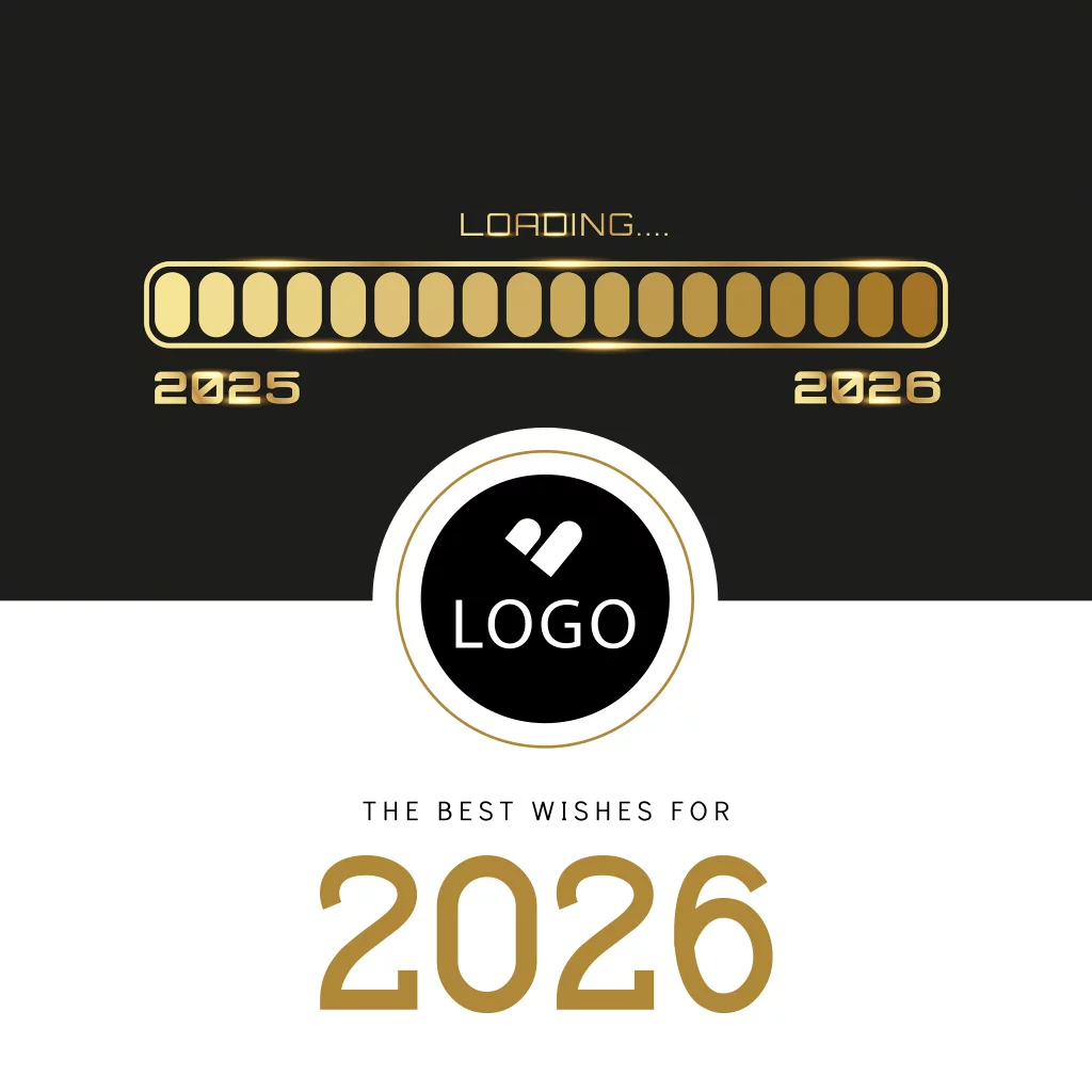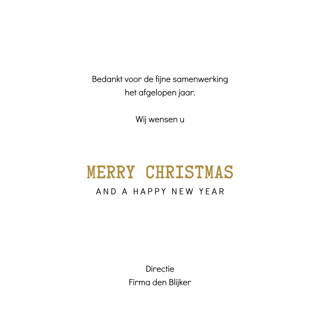 Zakelijke kerstkaart voor alle sectoren met het jaartal 2026 in mooie goudkleurige cijfers. Op deze kaart is het mogelijk om op de voorzijde een eigen bedrijfslogo toe te voegen. Deze kaart is voor alle branches en sectoren geschikt. Hulp nodig bij het aanpassen van deze kaart? We helpen je graag!