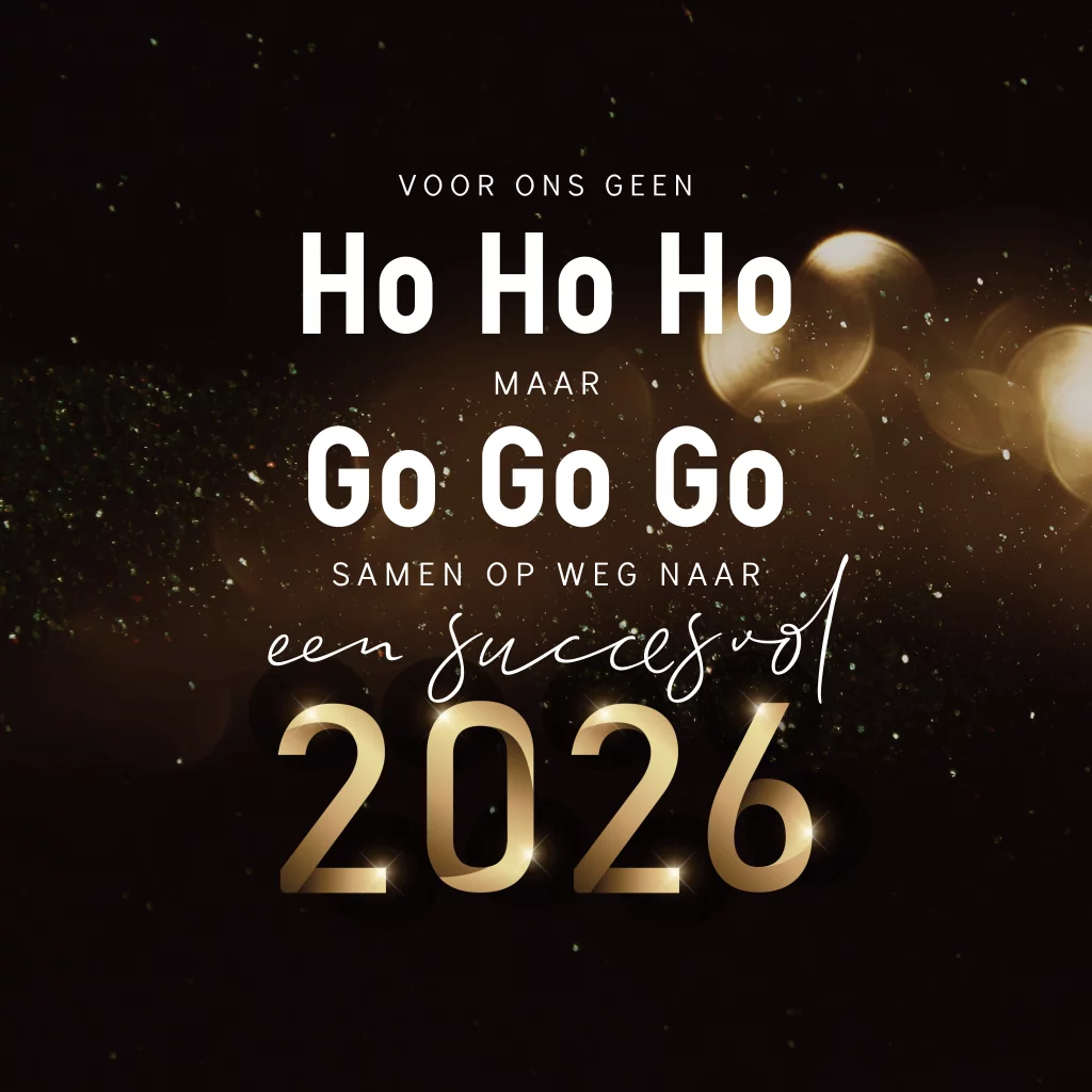 Hippe zakelijke kerstkaart met de tekst go go go, succesvol en ondernemend. Het jaartal 2026 spettert van de kaart af. Aan de binnenkant kan het bedrijfslogo worden geplaatst. Deze zakelijke kaart is voor veel bedrijven en instellingen te gebruiken en te personaliseren. Het ontwerpteam van Blijkaartje helpt je graag met het aanpassen van de kaart.