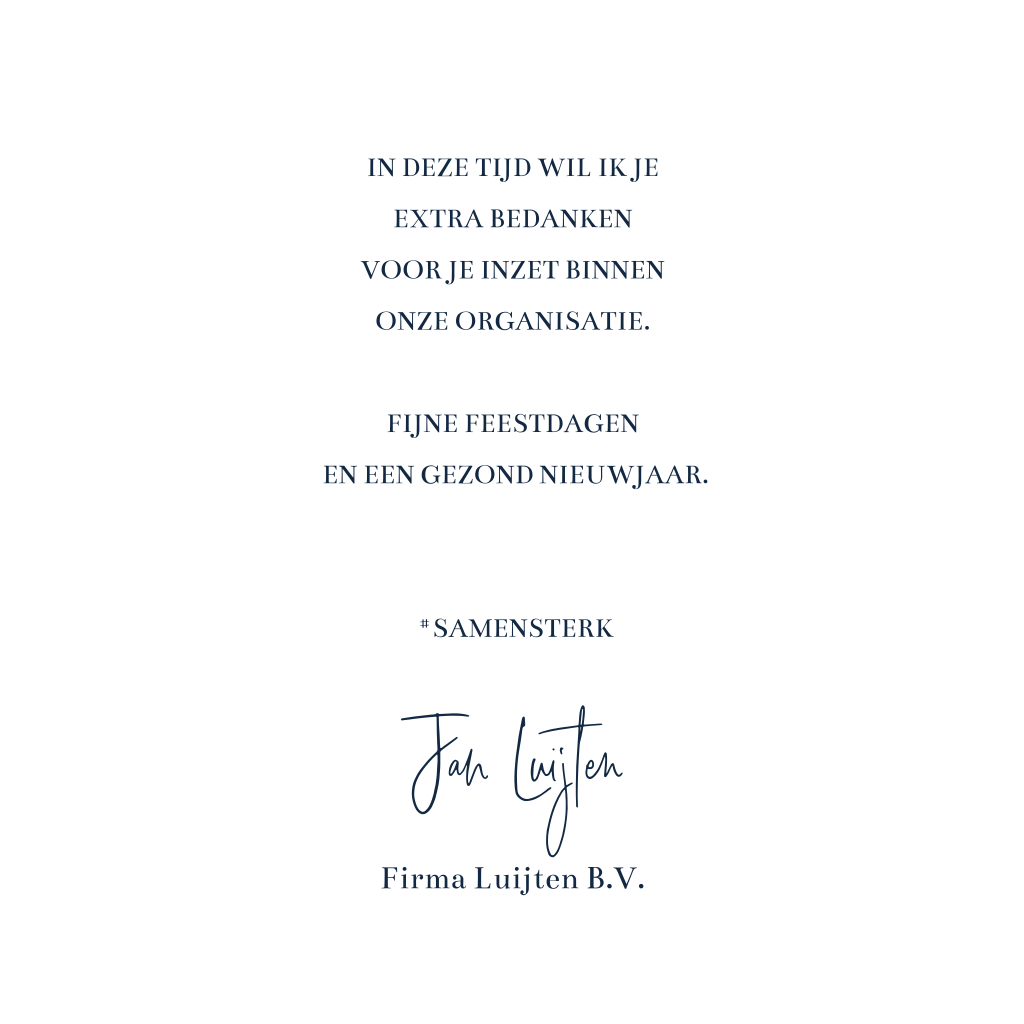 Wil jij je medewerkers of klanten laten weten dat je hun enorme inzet in het afgelopen jaar erg waardeert? Zeg het met een kerstkaart! Op deze zakelijke kerstkaart staat een gouden hart op een mooie donkerblauwe achtergrond. Met de tekst "Hartstikke bedankt" kun je je waardering uitspreken en een gevoel van samen sterk meegeven. Pas de teksten naar je eigen wens aan in onze editor.
