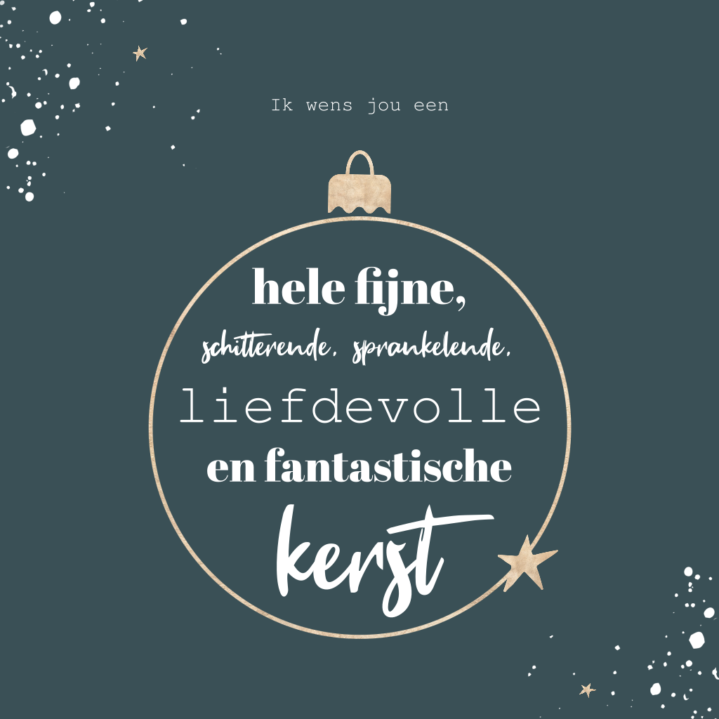 Een zakelijke kerstkaart met een goudkleurige kerstbal. In de kerstbal staat de tekst" Ik wens jou een hele fijne, schitterende, sprankelende, liefdevolle en fantastische kerst. Er is gebruik gemaakt van verschillende lettertypes. De spetters en gouden sterretjes maken de kaart helemaal af. Teksten en kleuren zijn makkelijk aan te passen in onze editor. Opmaakhulp nodig? Wij helpen je graag.