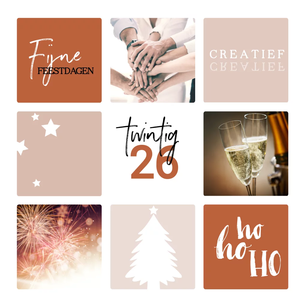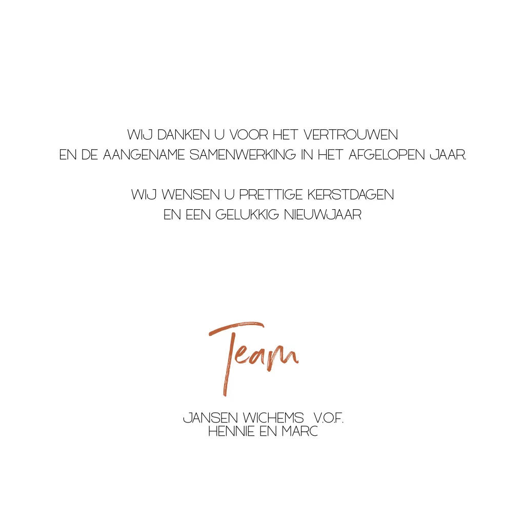 Een zakelijke kerstkaart met verschillende vlakken. In deze trendy gekleurde vlakken staan sfeervolle foto's en teksten zoals creatief en fijne feestdagen. De foto's zijn ook te vervangen door persoonlijke bedrijfsfoto's. Op de binnenzijde is ruimte om een bedrijfslogo toe te voegen. De kleuren en teksten op dit kaartje zijn makkelijk aan te passen in onze editor.