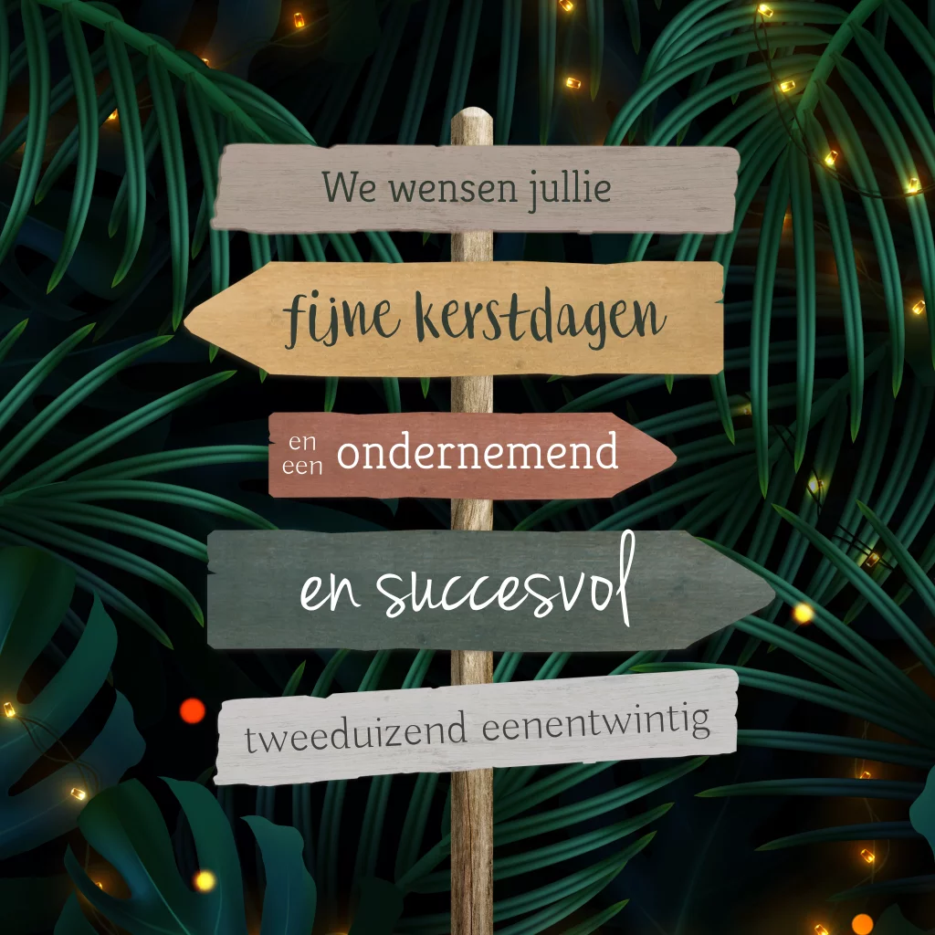Zakelijke kerstkaart met lampjes en bordjes. Op deze kaart staan houten wegwijzers met tekst zoals ondernemend en succesvol. De tekst is gemakkelijk aan te passen. Deze zakelijke kaart is voor veel bedrijven en instellingen te gebruiken en te personaliseren. Het ontwerpteam van Blijkaartje helpt je graag met het aanpassen van de kaart.