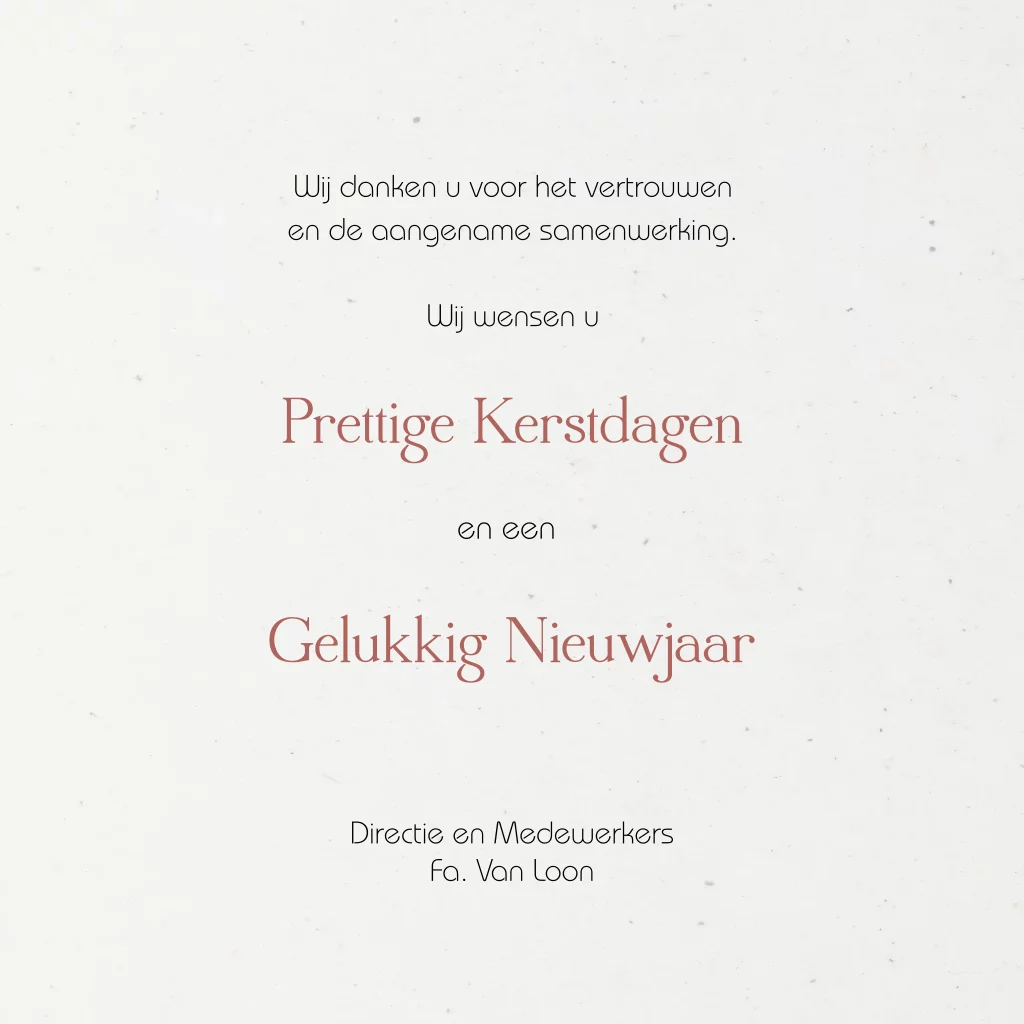 Deze zakelijke kerstkaart wordt gedrukt op gerecycled papier met zichtbare vezels. Het duurzame papier heeft een grijze ondertoon. Het papier is echter niet ruw en heeft ook geen voelbare structuur.