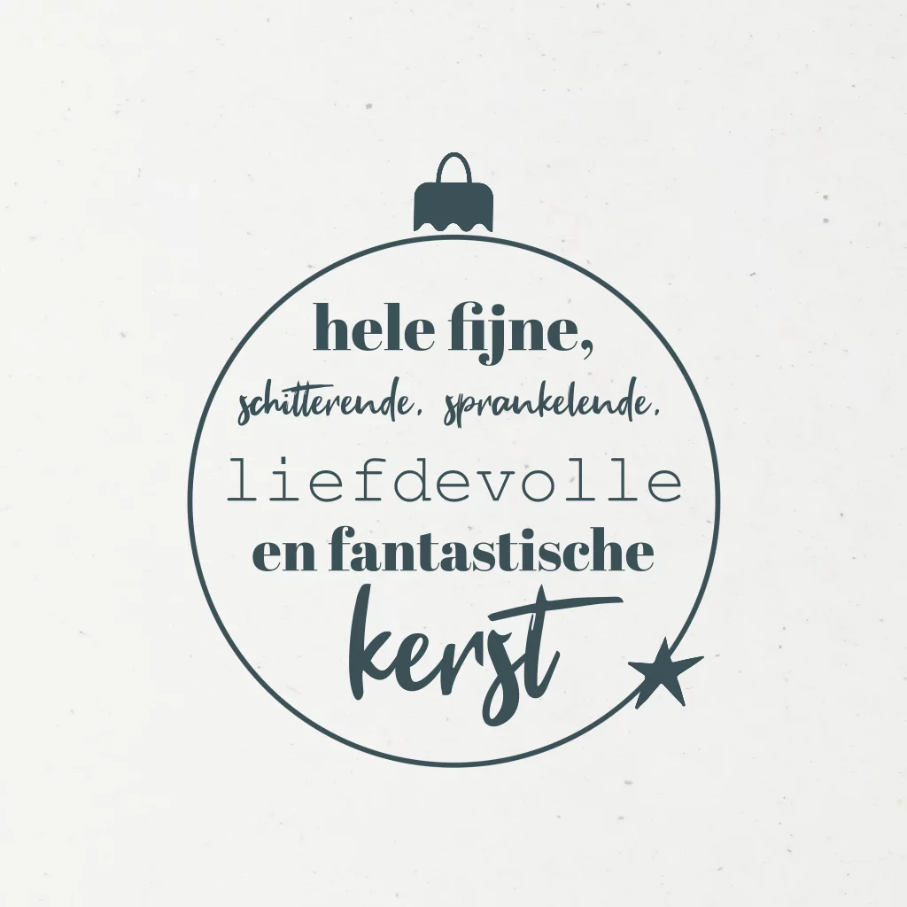 Een duurzame kerstkaart met een kerstbal en tekst in verschillende lettertypes. Op de binnenzijde is ruimte om een bedrijfslogo toe te voegen. Geschikt voor alle branches.