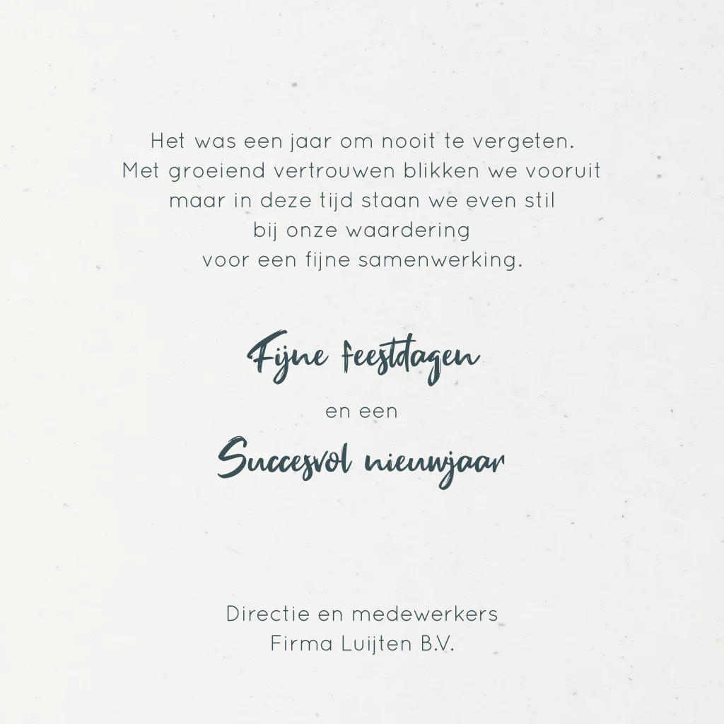 Deze zakelijke kerstkaart wordt gedrukt op gerecycled papier met zichtbare vezels. Het duurzame papier heeft een grijze ondertoon. Het papier is echter niet ruw en heeft ook geen voelbare structuur.