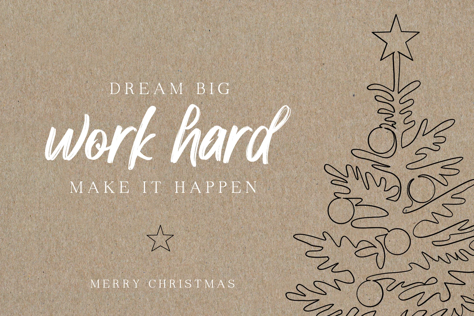 Op deze zakelijke kerstkaart op écht kraftpapier de tekst "Dream big, Work hard, Make it happen". Een prachtige tekst om je zakelijke contacten fijne feestdagen mee te wensen. Op dit kaartje een oneline kerstboom. Kraftpapier is een stevig papiersoort met een stoere uitstraling. Wil je toch liever een persoonlijke tekst toevoegen of het ontwerp aanpassen? Dat kan eenvoudig in onze editor.