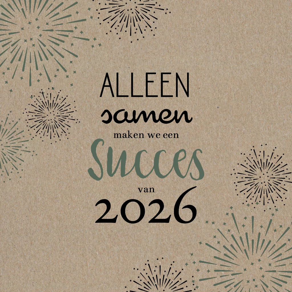 Écht kraftpapier voor een zakelijke kerstkaart. Op dit kaartje staan illustraties van vuurwerk en wordt de tekst weergegeven in verschillende lettertypes. Kraftpapier is een stevig papiersoort met een stoere uitstraling. Wil je toch liever een persoonlijke tekst toevoegen, dat kan makkelijk in onze editor.